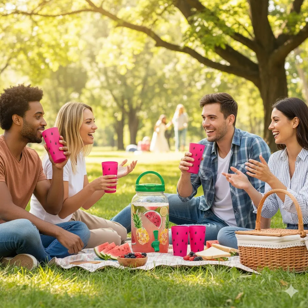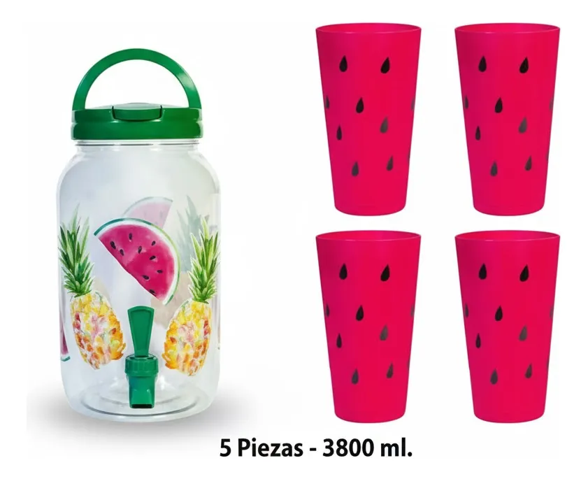Si buscás que tus reuniones tengan toda la onda del verano, este set es para vos. Con un diseño de sandĂas y piñas que es un fuego, este dispensador no solo sirve bebidas, sino que decora tu mesa y le pone color a cualquier momento del dĂa. Es práctico, es divertido y es 100% instagrameable. Lo que tenĂ©s que saber de Ă©l: Capacidad ideal: 3.5 litros para que la limonada o el jugo alcancen para todos sin vueltas. Combo Completo: Incluye 4 vasos fucsia a tono para que nadie se quede afuera. Material "Todo Terreno": Fabricado en plástico resistente, ideal para usar cerca de la pileta o con chicos sin miedo a roturas. Servicio fácil: Canilla frontal sĂşper cĂłmoda para que cada uno se sirva a su ritmo. Cierre Seguro: Tapa a rosca que evita que entren bichitos o suciedad mientras disfrutás al aire libre. Transporte práctico: Tapa con asa integrada para llevar el set de la cocina al jardĂn en un solo viaje. ÂżPor quĂ© lo vas a amar? Este set es la soluciĂłn definitiva para dejar de andar con botellas y vasos sueltos que nunca combinan. Lo mejor es que transforma cualquier tarde comĂşn en una verdadera experiencia: lo llenás con mucho hielo, rodajas de fruta y tu bebida favorita, y te olvidás. La canilla hace que hasta los más chicos puedan servirse solos sin hacer lĂo, dándote a vos más tiempo para relajarte. Su diseño compacto permite que lo guardes en cualquier estante sin ocupar mucho lugar, pero es tan lindo que seguro vas a querer tenerlo siempre a la vista. Es el compañero perfecto para picnics, cumpleaños o simplemente para tener agua fresca saborizada siempre lista en la mesada. Si querĂ©s calidad, funcionalidad y un toque de color que alegre tu casa, este equipo es un viaje de ida.